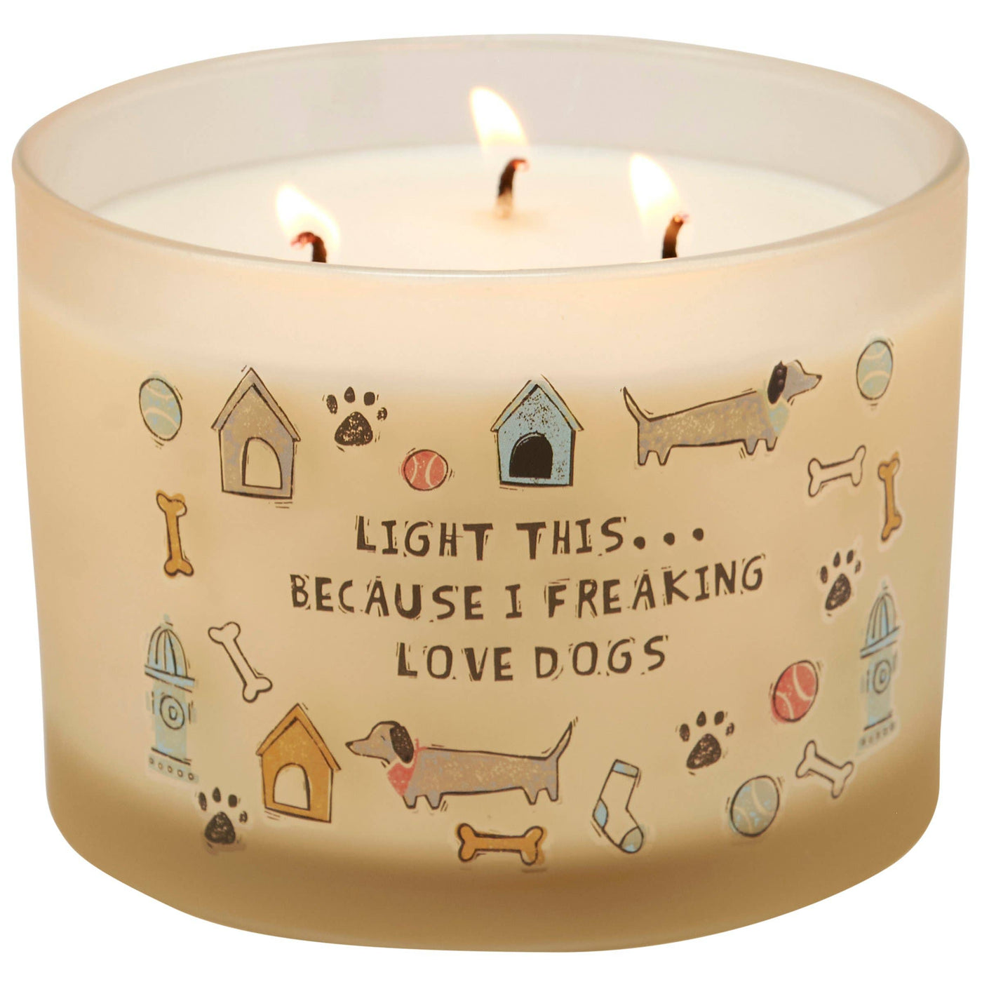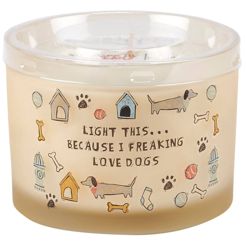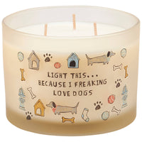 A candle from our Pet Collection displaying a double-sided design of dogs with toys and accessories on frosted glass with a fun pet inspired sentiment that reads "Light This... Because I Freaking Love Dogs." Pet designs are replicated from original block print style art. Dog candle features soy-based wax and 3 fabric wicks with 30 hours of burn time activating a calming Eucalyptus scent. Our Love Dogs candle includes a dust cover and plastic lid for protection and enhanced appearance on store displays. A fun pet-themed gift perfect for an everyday home accent.