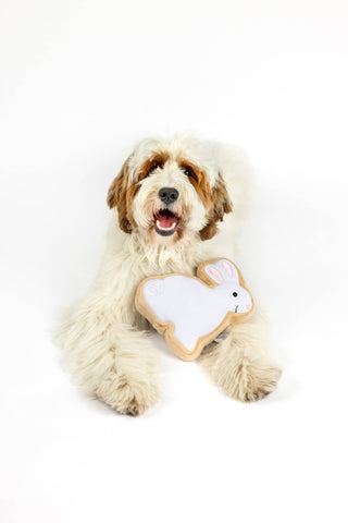 Fill your pup's Easter basket with the Midlee White Bunny Sugar Cookie Dog Toy! Made to look like a bunny-shaped sugar cookie, it is soft with a squeaker inside for added fun! Available in two sizes.
