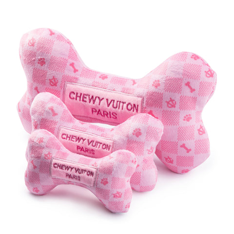 Treat your pup to a luxurious play session with our Pink Checker Chewy Vuiton Bones! These plush, squeaky toys boast a three sizes that suits all breeds, adding a touch of fashion-forward flair to your dog's collection. Fashion meets fun with every joyful squeak!