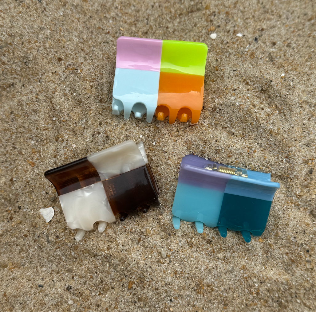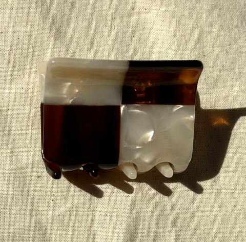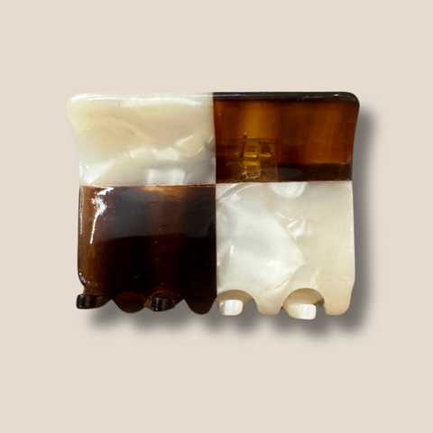 A medium sized hair clip that merges two classic finishes for a standout look. This clip features a design with four quadrants—two in tortoise and two in pearlescent white. The blend of warm, earthy tones with sleek, polished accents creates a perfect balance, making it versatile enough for both everyday wear and special occasions. Ideal for securing any hairstyle, this chic claw adds a touch of elegance with a modern twist.