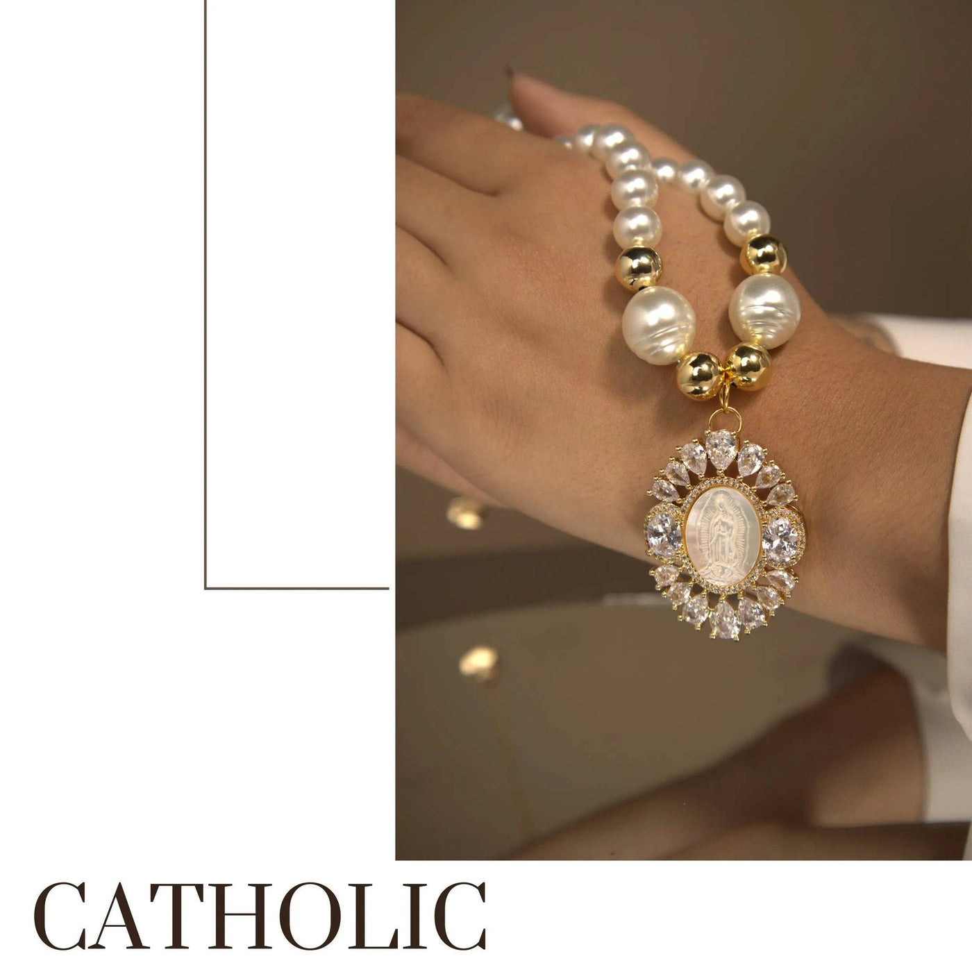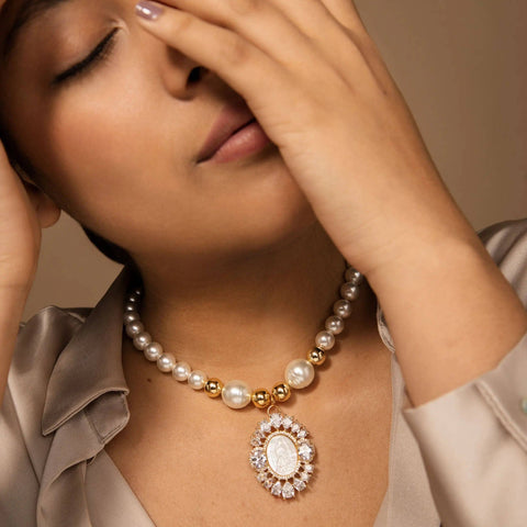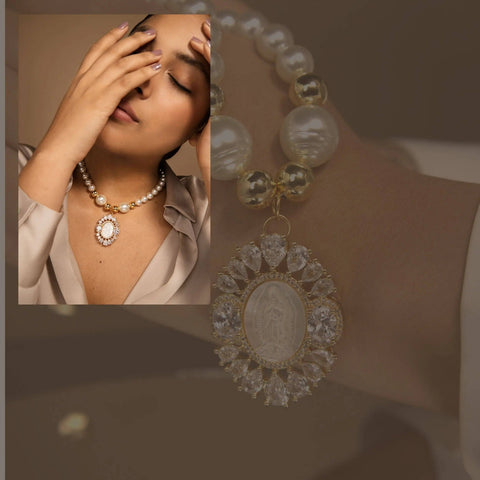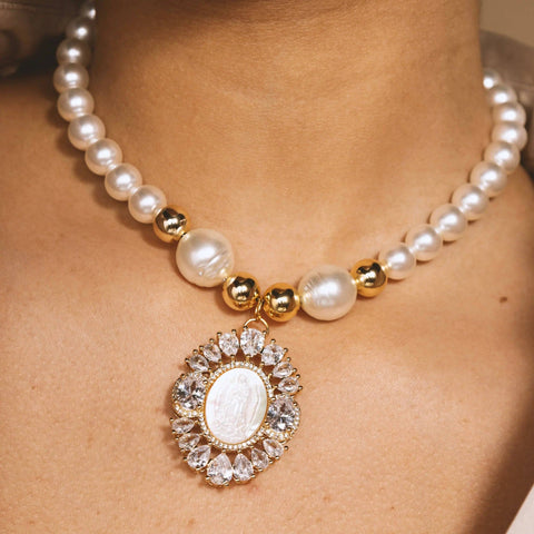 Introducing our Glass Pearl Necklace with Pearlescent Finish and Virgin Mary Pendant, a piece of jewelry that embodies the essence of elegance and faith. Each round glass bead has been finely crafted to capture the luminescence of mother-of-pearl, offering a subtle shine and a touch of sophistication.