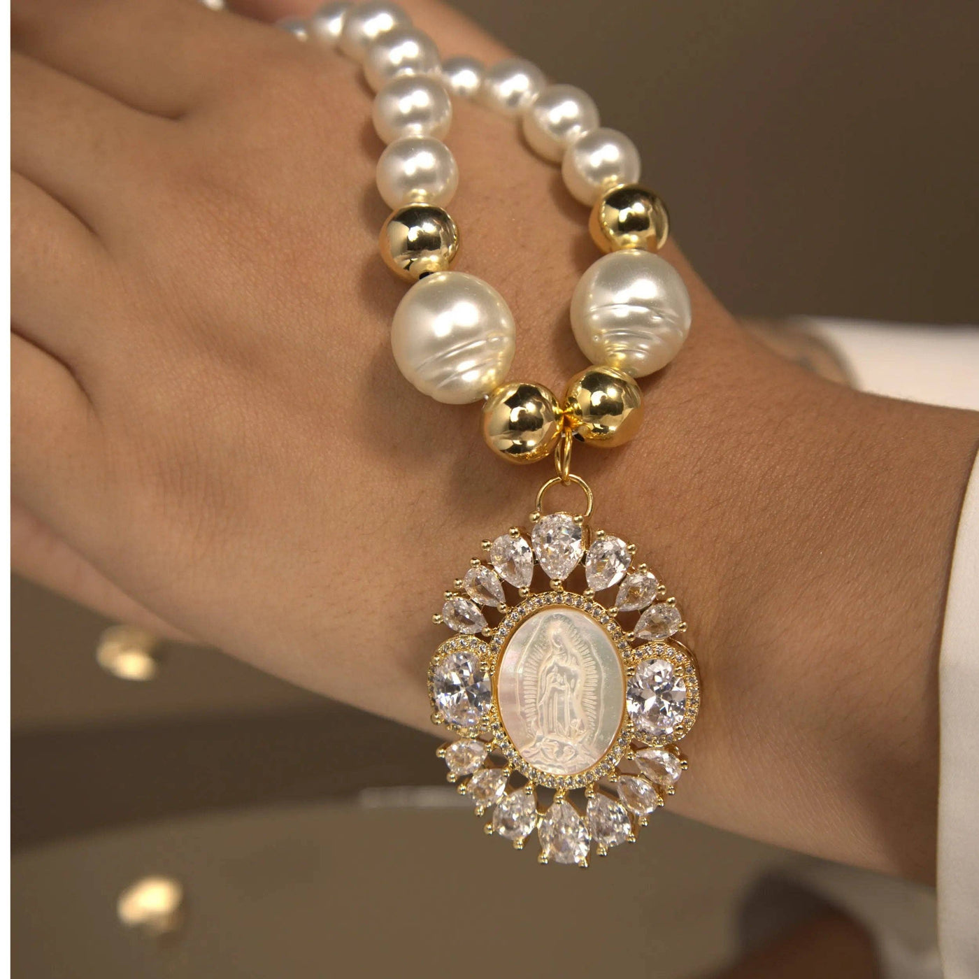 The centerpiece is a stunning Virgin Mary pendant, meticulously carved from mother-of-pearl, radiating heavenly serenity and unparalleled delicacy.