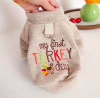 Celebrate your pup’s very first Thanksgiving in the sweetest way! This cozy ribbed beige dog shirt features adorable, embroidered lettering with bright fall colors and a tiny turkey graphic for extra festive charm. The soft, stretchy fabric keeps your dog comfy all day long, and the built-in D-ring makes it easy to attach a leash for holiday strolls. Perfect for Thanksgiving photos, family gatherings, and showing off your little turkey! XS is 8 inches long, Small is 10 inches long, Medium is 12 inches long, Large is 15 inches long, and XL is 18 inches long.