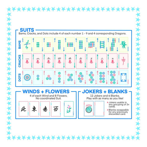 Our Mahjong cards are designed for beginners and on-the-go enthusiasts alike. No rack or mat necessary and line card is optional with Quick Play format. Best played by 2-4 players.