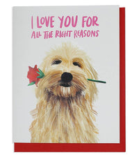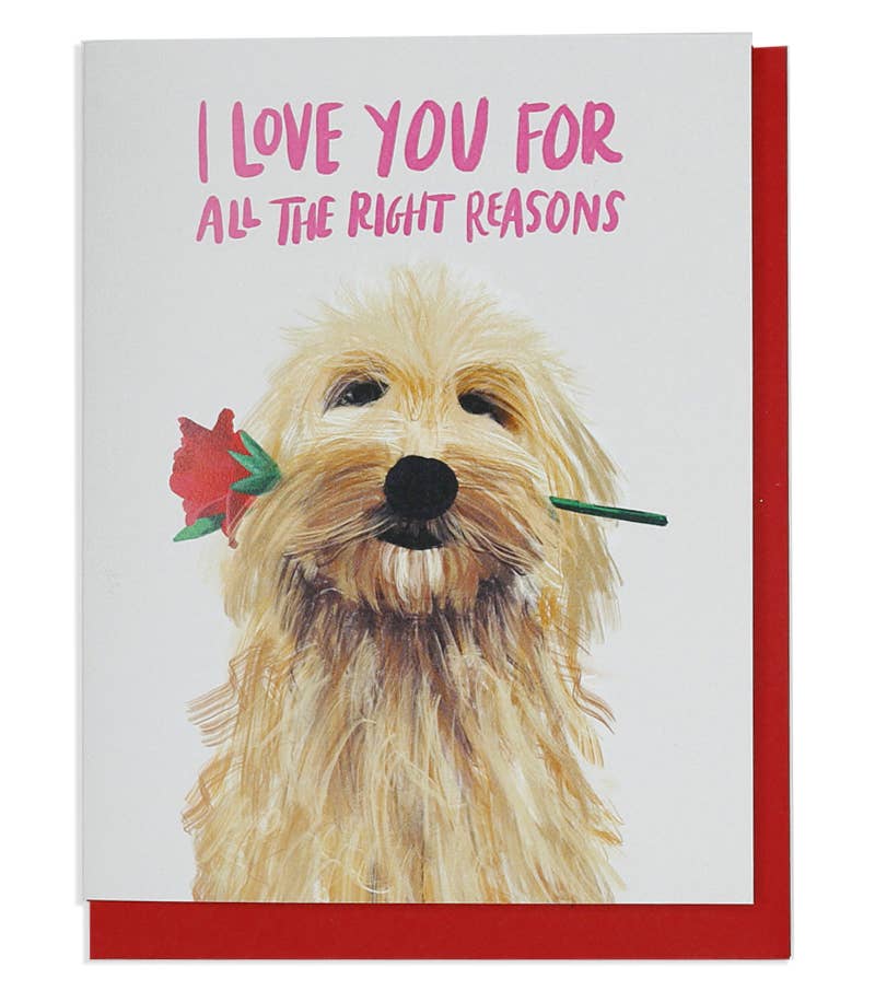 We love our pups here at Thimblepress, and we are also huge fans of the show “The Bachelor” & “The Bachelorette” on ABC. With those two in mind, we created this fun and funny greeting card! It reads, “I love you for all the right reasons!”
