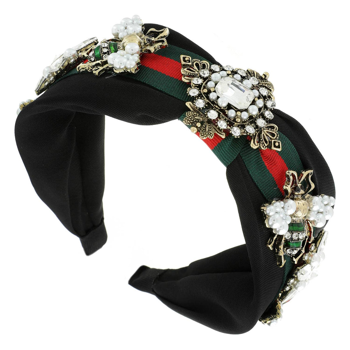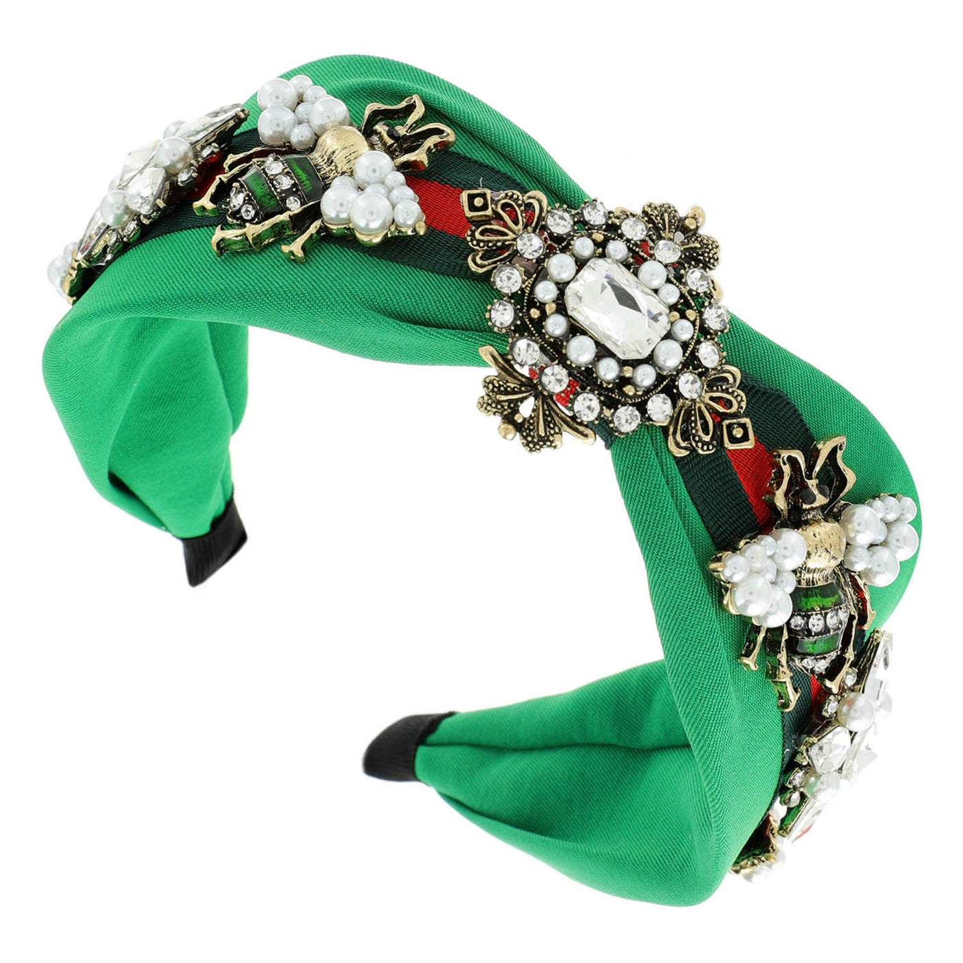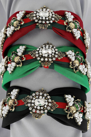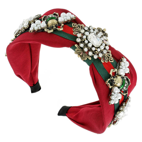 Make a statement with our Rhinestone Gem & Pearl Bee Green/Red Knot Stripe Headband. The headband features a bold and intricate design, with a knotted stripe pattern in Green and Red that adds a touch of festive flair. The centerpiece of the headband is a beautiful and articulate array of rhinestone gems and delicate faux pearls, alongside bees that are adorned with the same rhinestone gems and faux pearls as well. These details add a touch of glamour and sophistication to your look. The headband is made from high-quality materials and offers a comfortable fit that stays securely in place. This headband is perfect for adding a touch of whimsy and elegance to any outfit. Elevate your accessory game with our Rhinestone Gem & Pearl Bee Green/Red Knot Stripe Headband today.