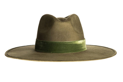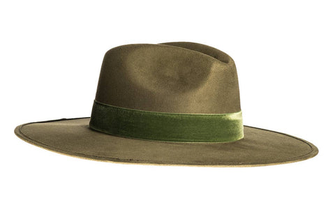 The crown of the Sierra hat is stiffened and shaped into a clean and ridged design that is swathed in faux suede, which is finished with a velvet trim.